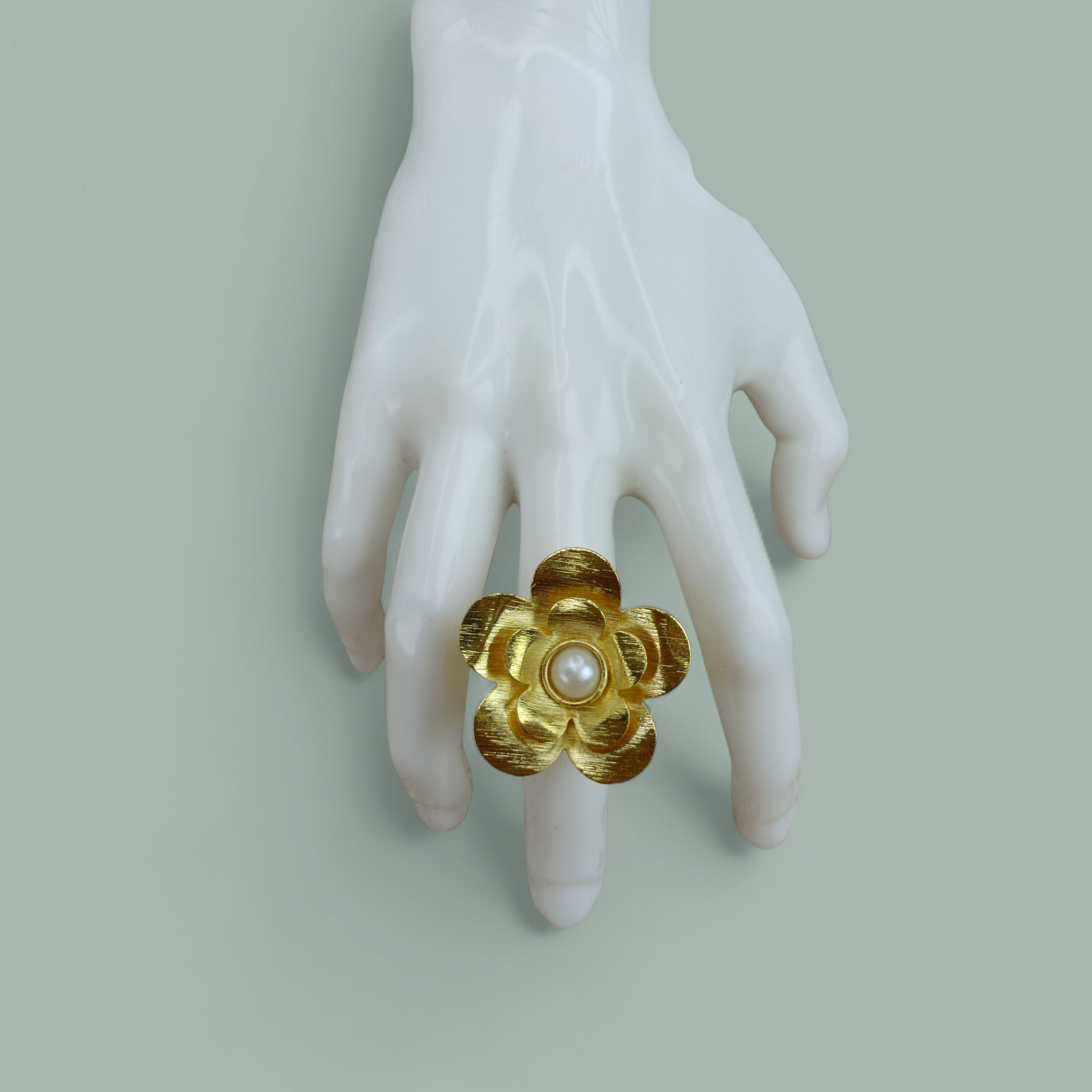 Este anillo en bronce, cuidadosamente bañado en oro de 24 quilates, destaca por su diseño en forma de flor que incorpora una delicada perla en el centro. Su talla ajustable garantiza un ajuste cómodo y personalizado, adaptándose a diferentes tamaños de dedo sin perder elegancia. La combinación de materiales nobles y el acabado artesanal hacen de esta pieza una joya sofisticada, ideal para quienes buscan un accesorio que refleje tanto estilo como calidad duradera. Perfecto para complementar cualquier atuendo con un toque de distinción y naturalidad.