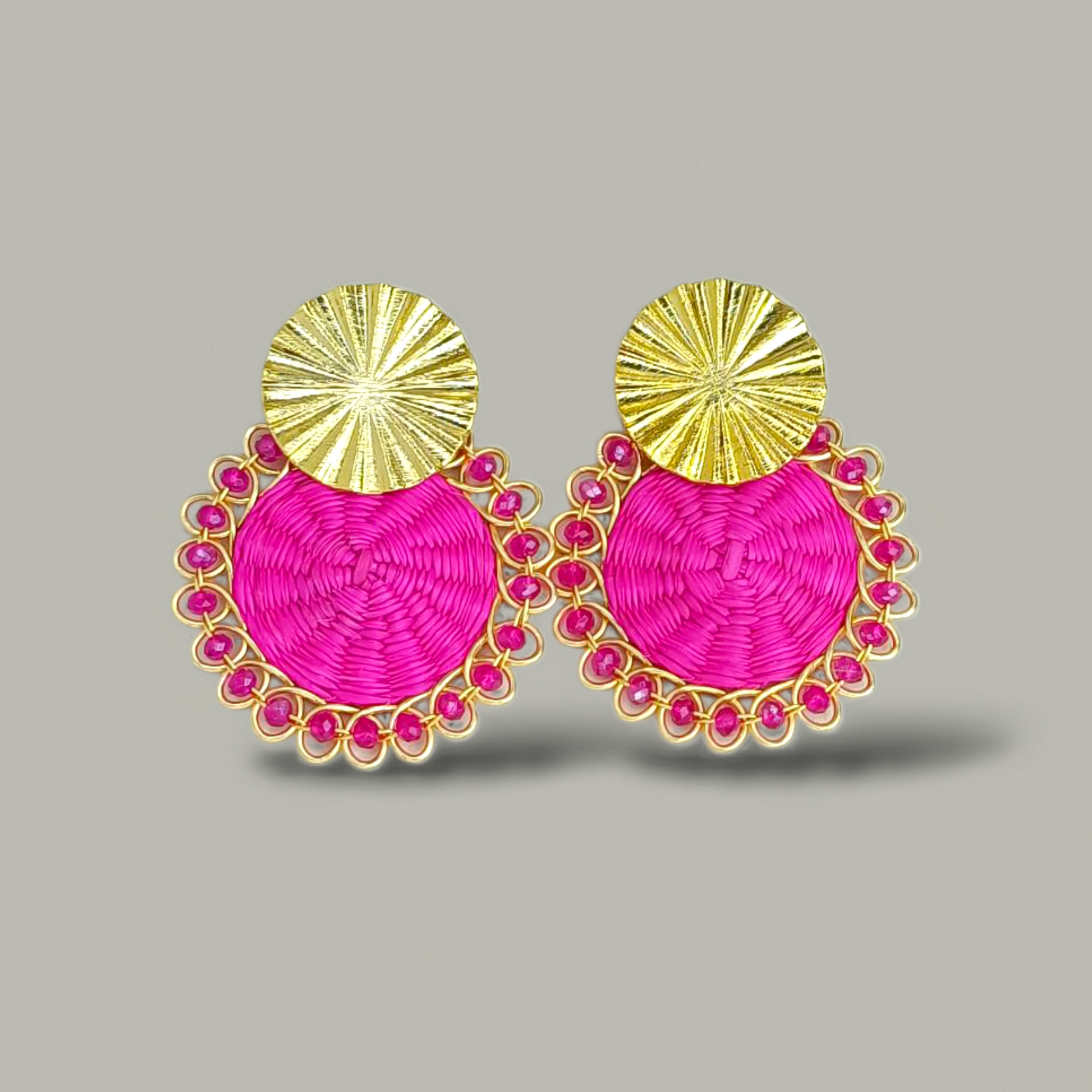 The Arete Iraca Mini is a finely crafted earring featuring intricate weaving in natural Iraca palm fibers, showcasing expert alambrismo techniques. Each piece is adorned with a delicate Murano crystal, adding a subtle sparkle that complements the warm bronze base. The bronze is elegantly finished with a 24k gold plating, enhancing durability and providing a luxurious shine. This mini earring combines traditional craftsmanship with refined materials, making it a sophisticated accessory that highlights artisanal skill and timeless beauty. Ideal for those who appreciate detailed, handcrafted jewelry with a touch of elegance.