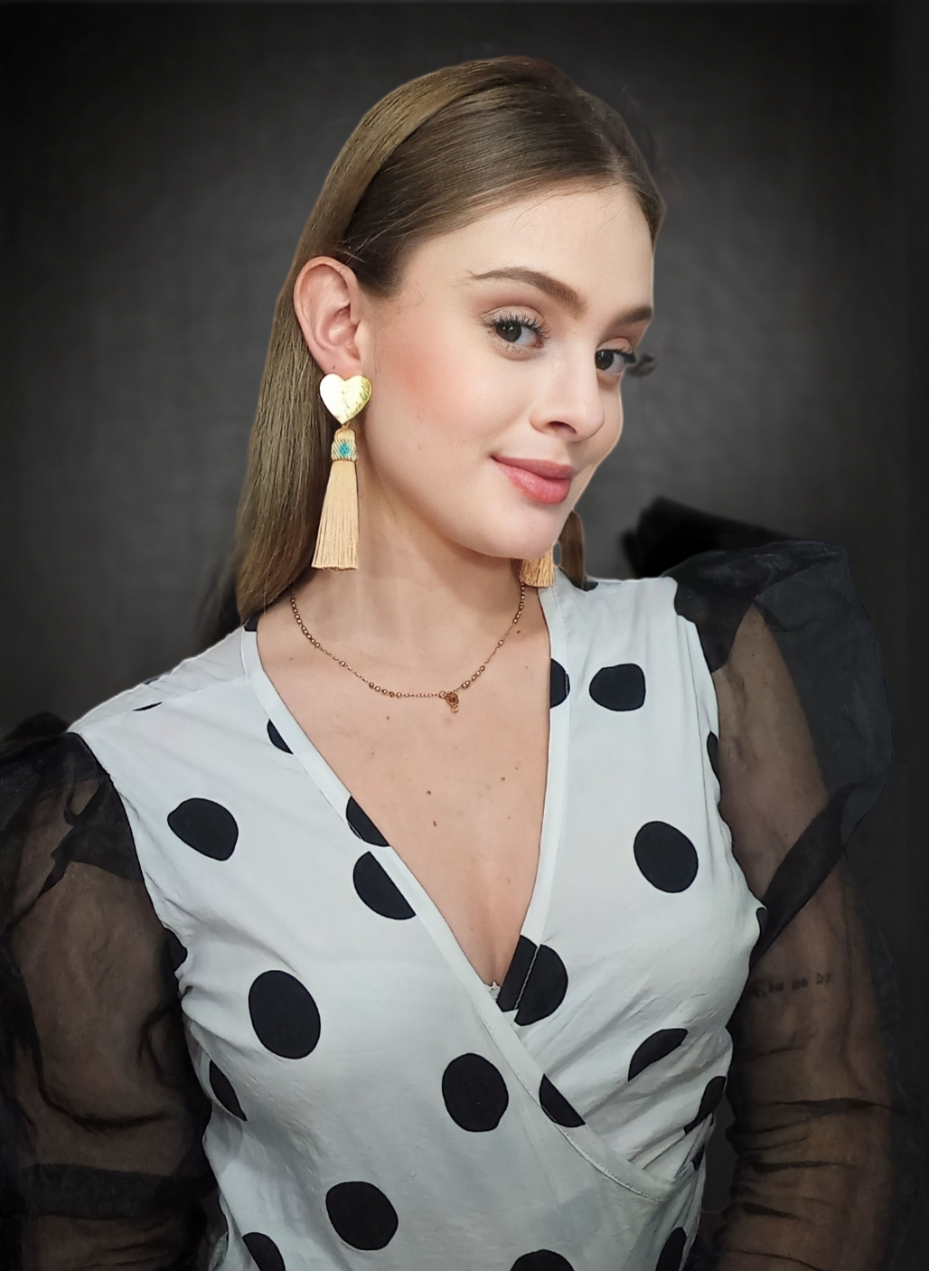 Maxi arete largo Borla con topo corazón en bronce con baño de oro de 24 quilates
